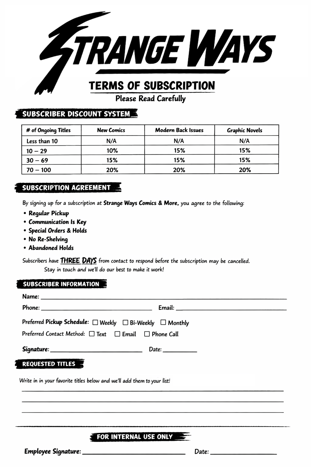 Want to ensure that you don't miss the newest and truest of your favorite comic books, graphic novels, and periodicals? We want to help you! Click below to get hooked up with the STRANGE WAYS SUBSCRIPTION SERVICE, the latest technology in comic book subscription technology!